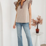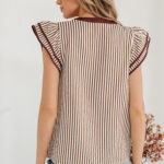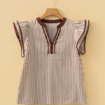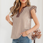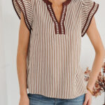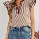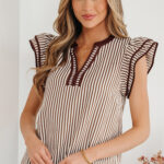 Be the first to review “Khaki Stripe Double Ruffled Short Sleeve V Neck Blouse”