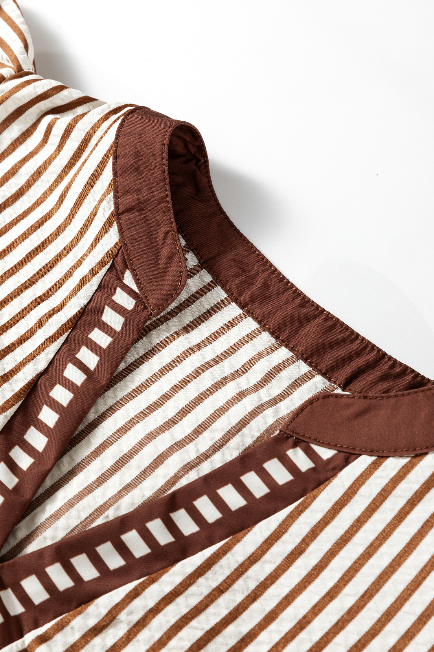 Khaki Stripe Double Ruffled Short Sleeve V Neck Blouse