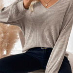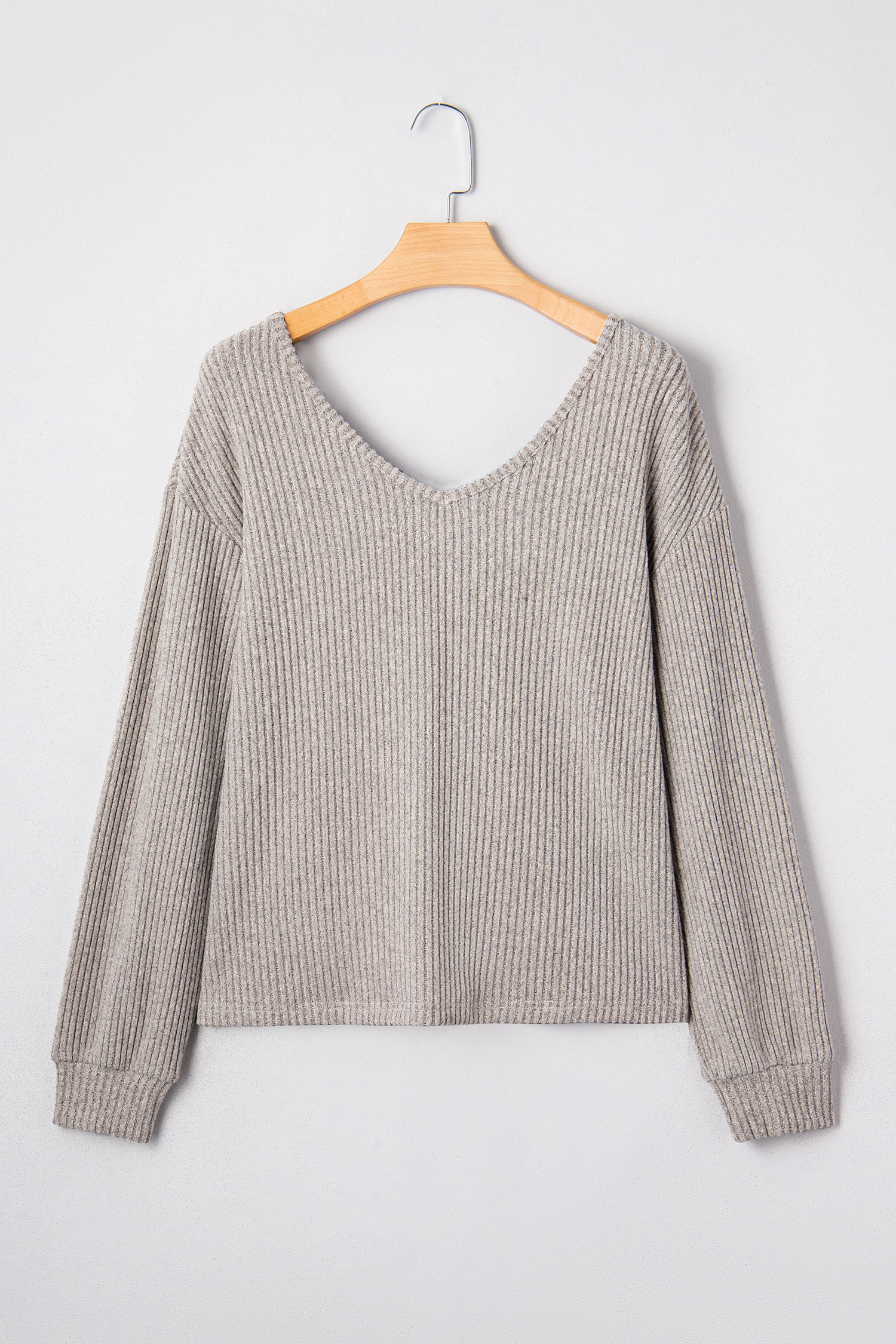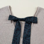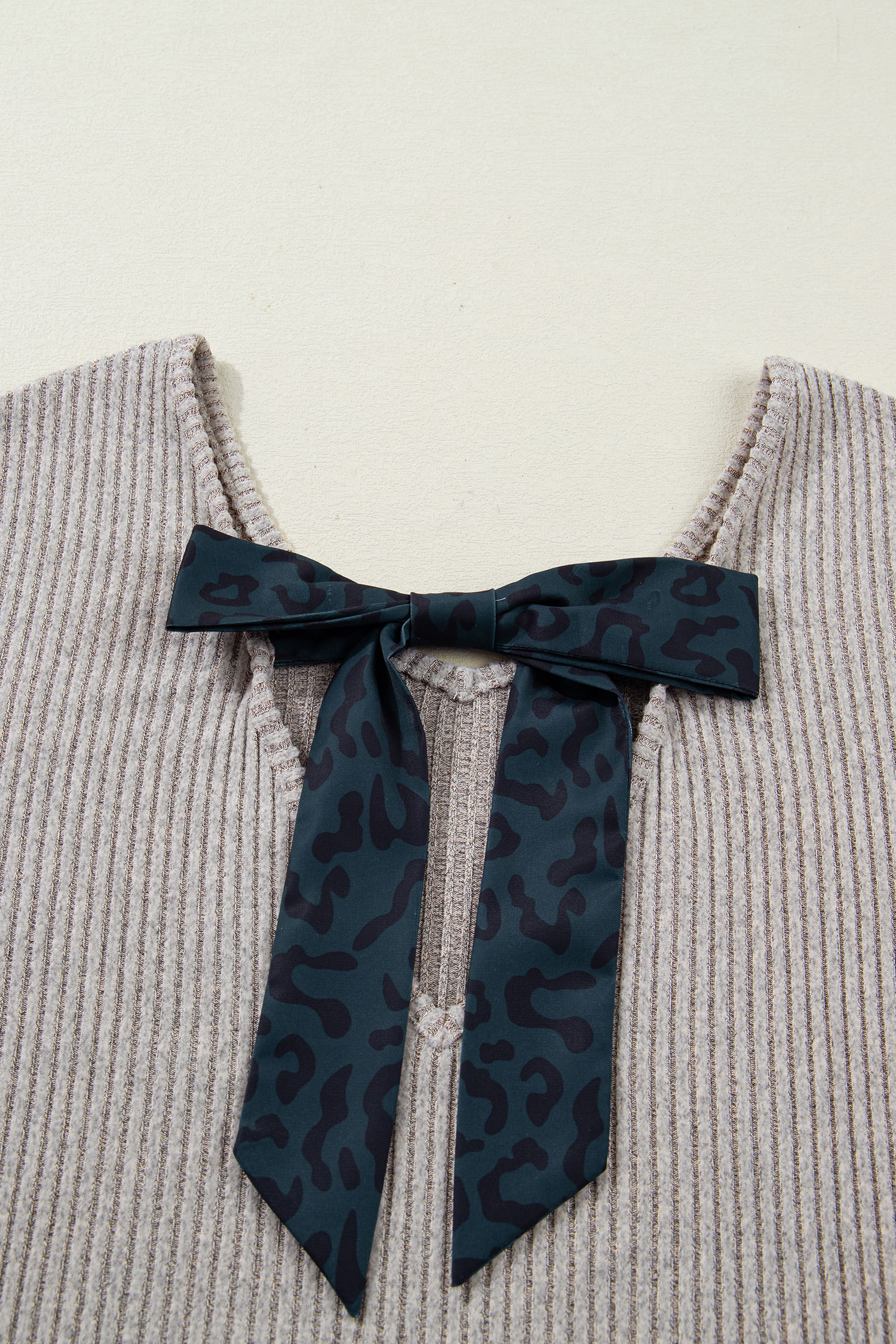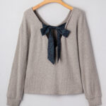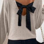 - Elegant ribbed V neck top with a charming ribbon bow back detail.