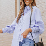 - Turn-down collar, long sleeves with smocked cuffs, bust pocket and front button closures